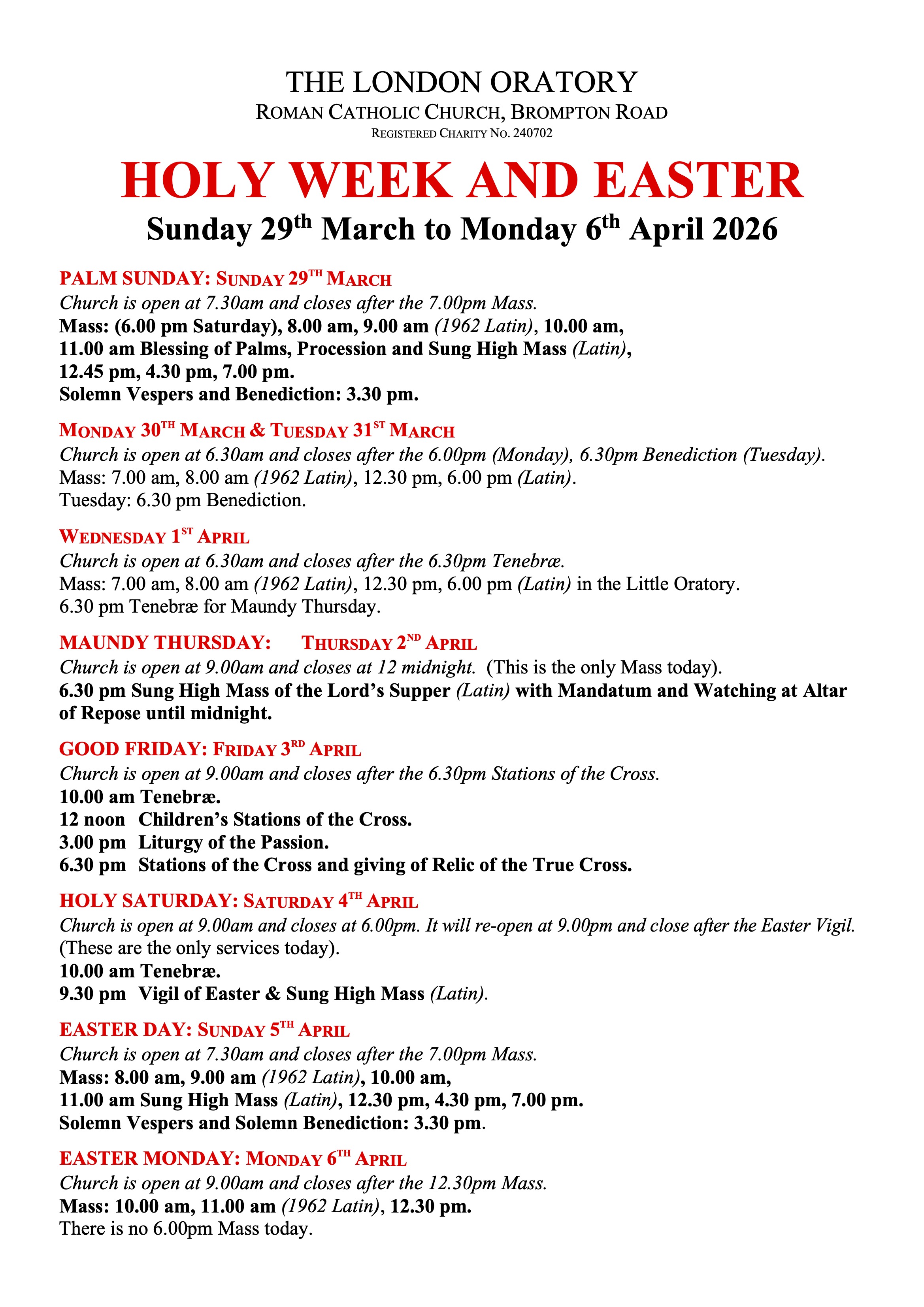 Here you find regularly updated information about Holy Days of Obligation and other feast daysduring the liturgical year, as well as special events at the Oratory
